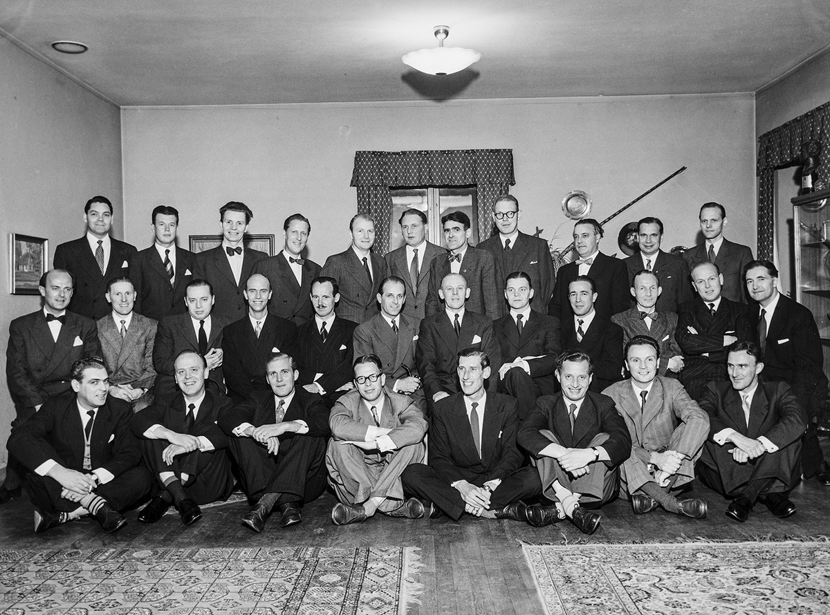 Kamratträff efter ett antal år (1956?). Huvuddelen av dessa 1934 års volontärer hade då lämnat det militära och övergott till civil verksamhet. Ett undantag var Åke Dahlberg som hade fortsatt urbildningen till officer. I mellersta raden nr 6 från höger sitter en av det gamla befälet och läraren K.O.L. Forsberg. Fotot är taget på underofficersmässen S 1 Frösunda. Foto från Åke Dahlberg