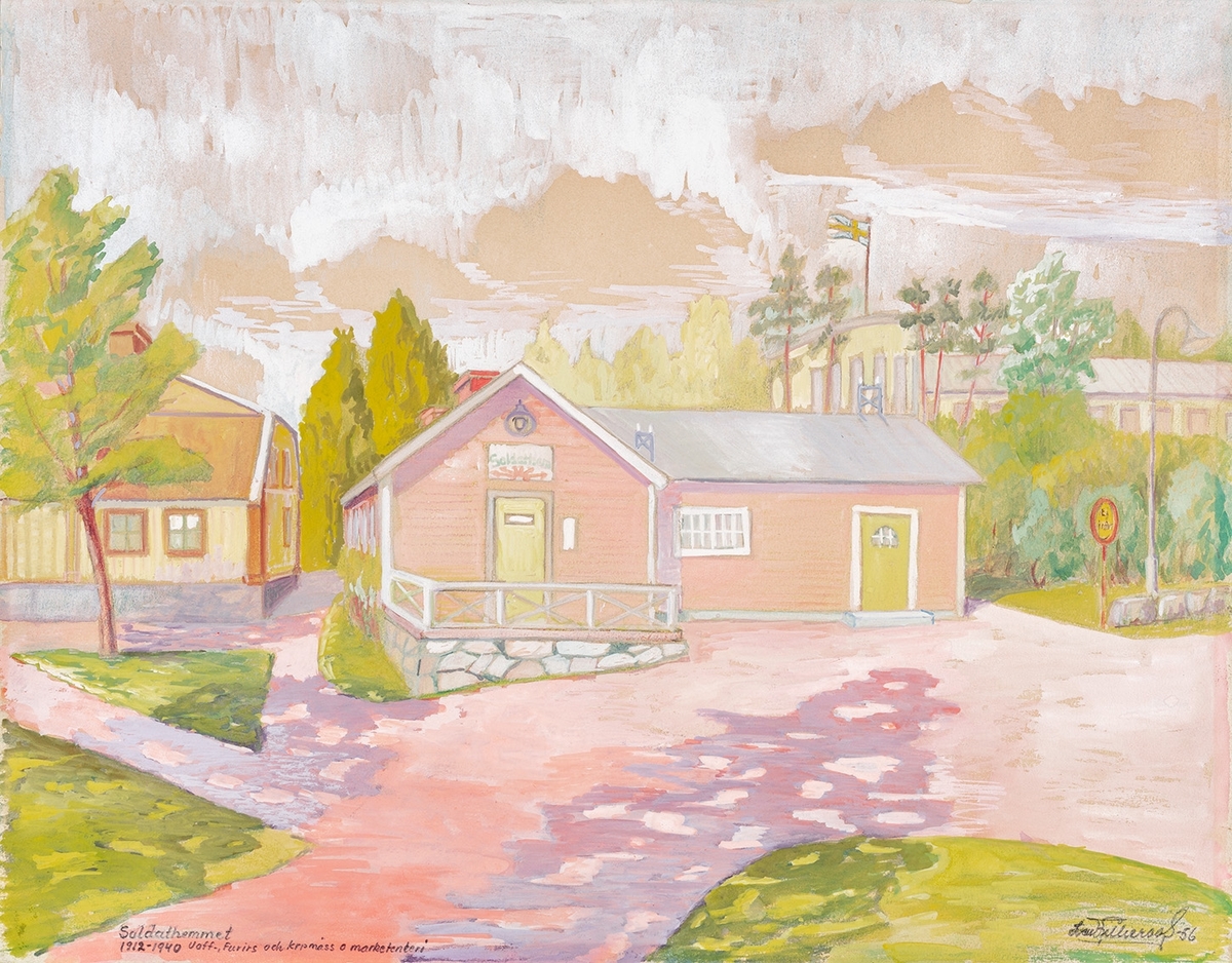 Titel: Soldathemmet med uoff-furirs och korpralmäss och marketenteri. På baksidan planskiss. Frösunda