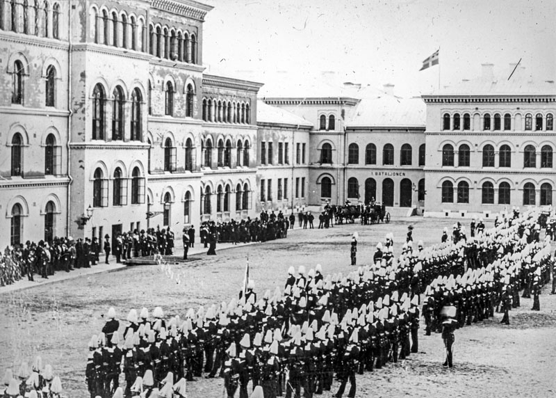 Titel: Trupp uppställd för avlämning vid kasern på Linnégatan Stockholm