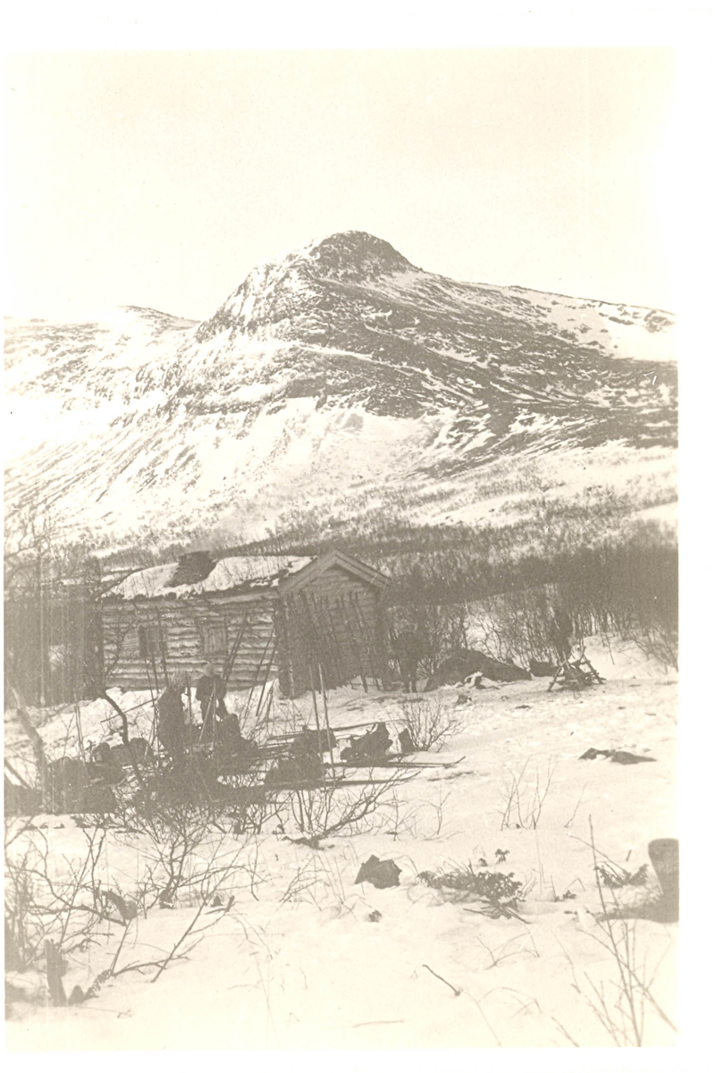 Fjällmarsch, 1940-tal, fjällstuga med fjälltopp i fonden