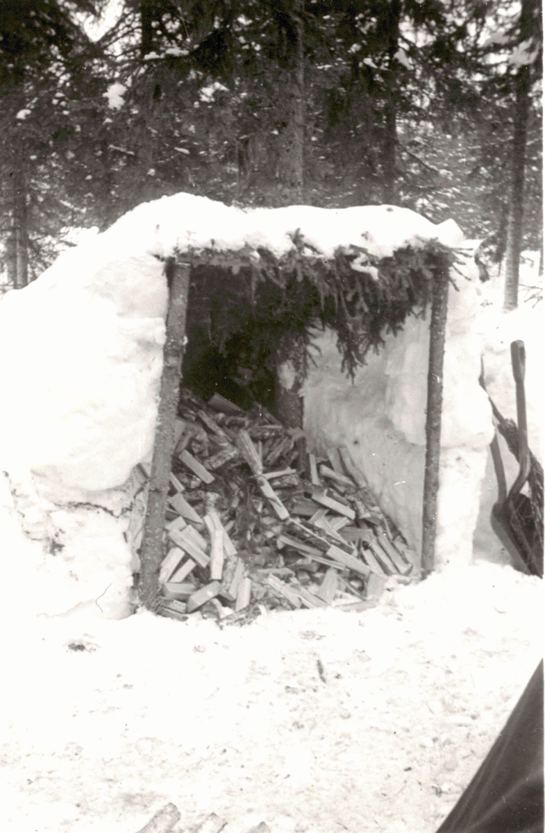 Titel: Förläggningsplats under vinterövning. Vedförråd