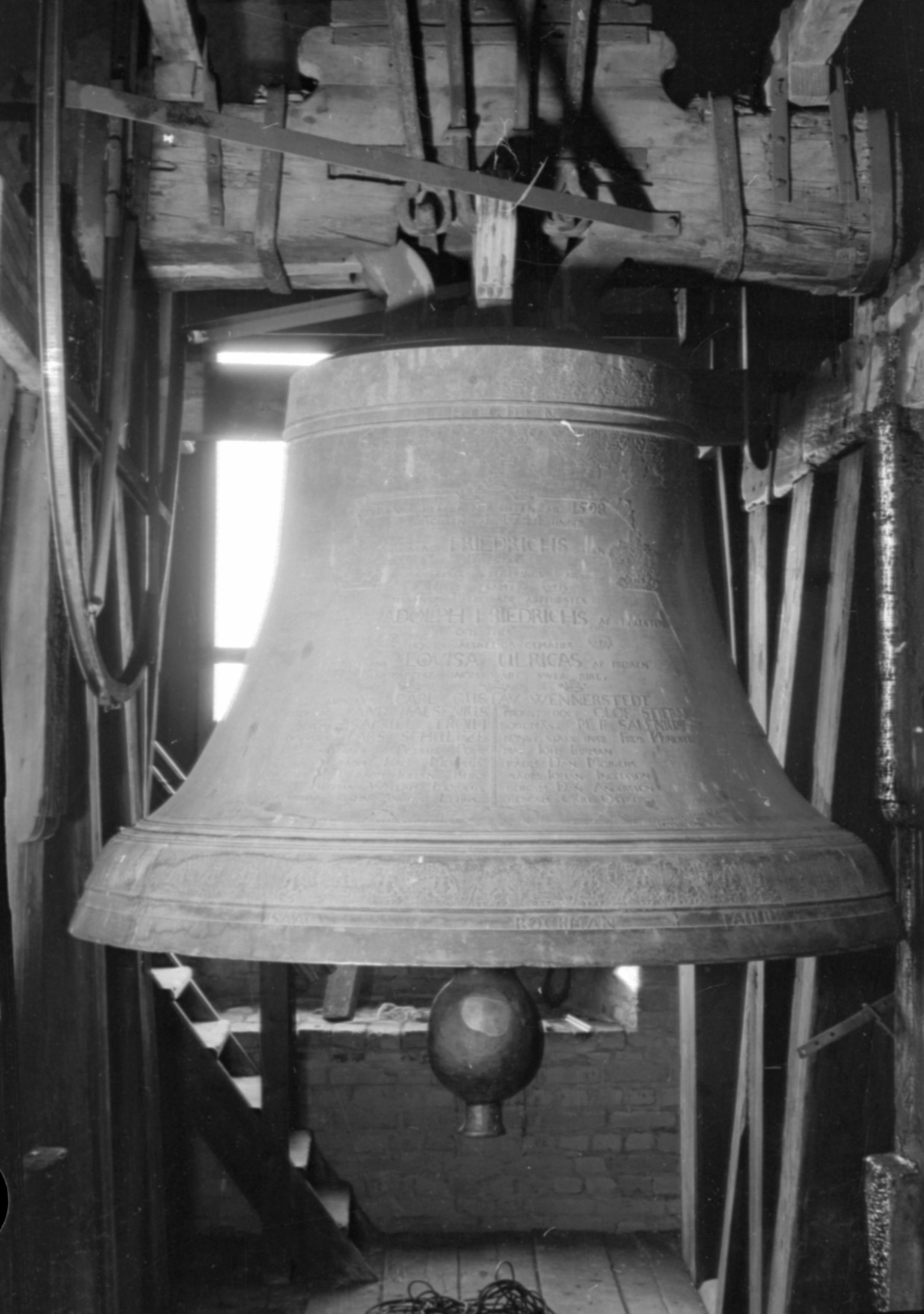 Lillklockan av malm. Gjuten år 1628 i Falun. Omgjuten år 1706 av Gerhard Meyer.