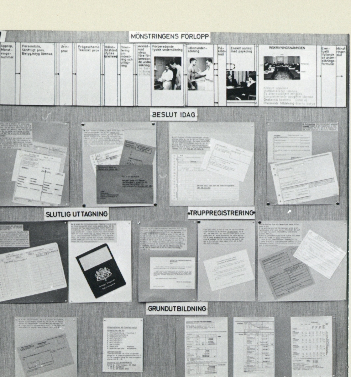 Informationstavla angående mönstringens förlopp m m. Tavlan kompletterades med en försvarsupplysande diabildserie med tal och musik på bandspelare.