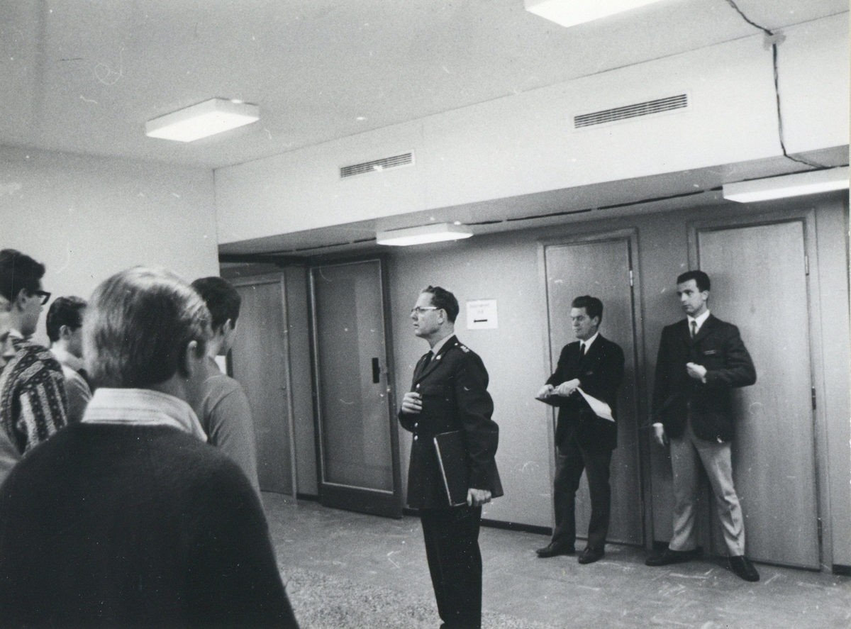 Upprop 1968 i fritidsgården Tunet, Uppsala. Fr v fanjunkare Dolk, provledaren, kapten Boman och stf provledaren Lötman