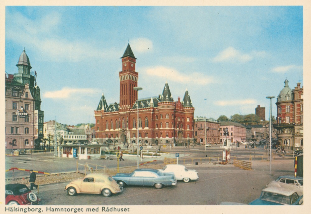 Vykort i färg förställande Hamntorget och Rådhuset i Helsingborg