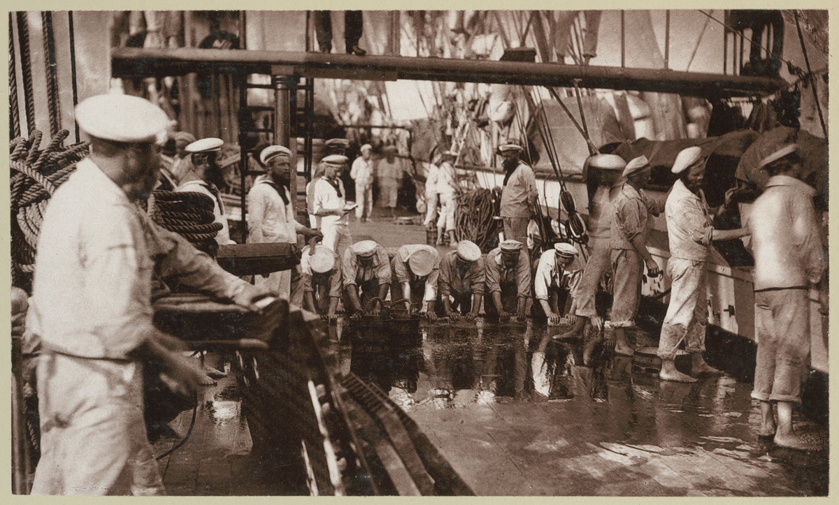 Bilden visar hur däcket på korvetten Stosch rengörs med stenar och sand.