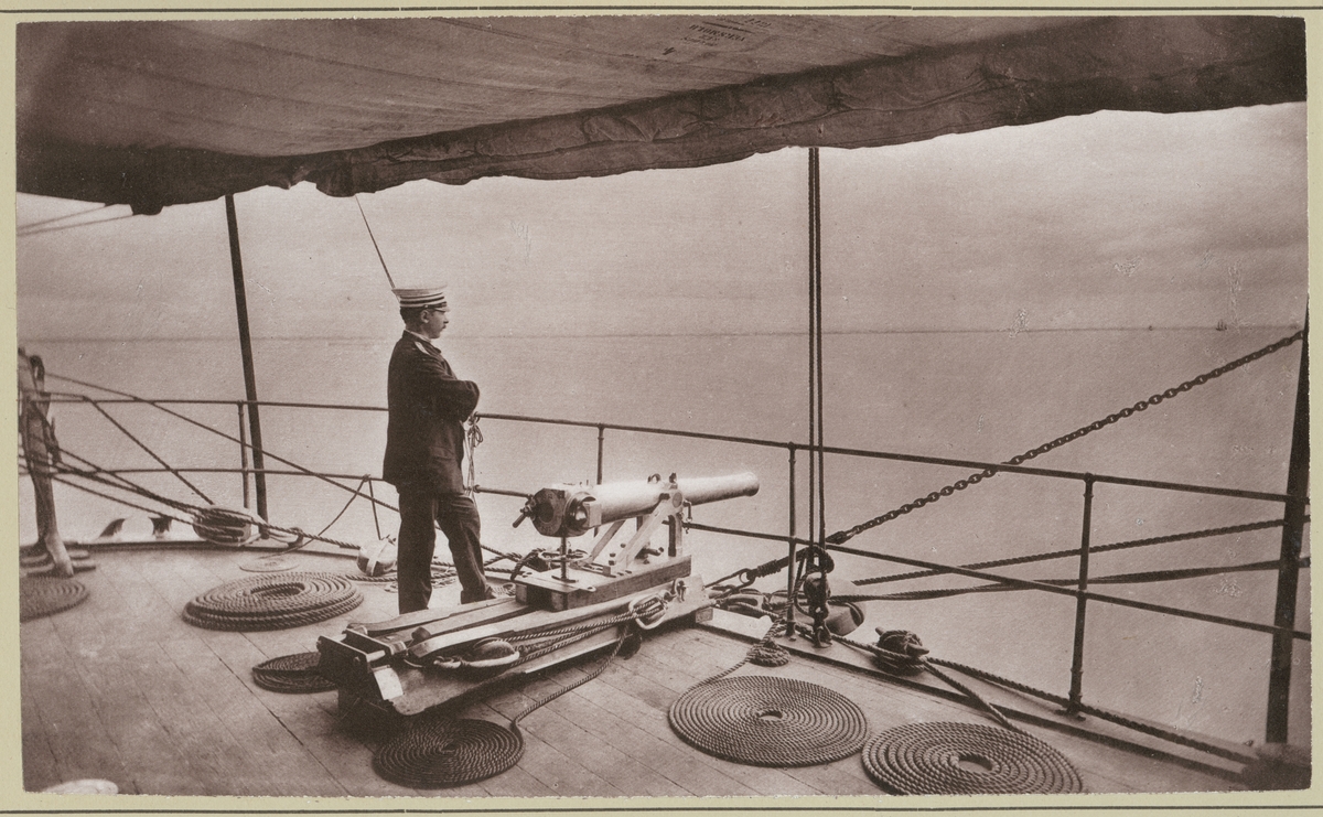 Bilden visar läkaren ombord på korvetten Stosch som njuter vindstillheten på däcket och tittar ut över havet.