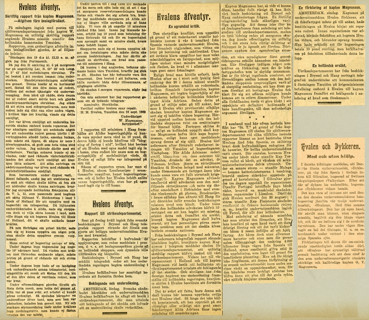 Titel: Tidningsurklipp om ubåten HVALENs hemfärd till Sverige från Italien.