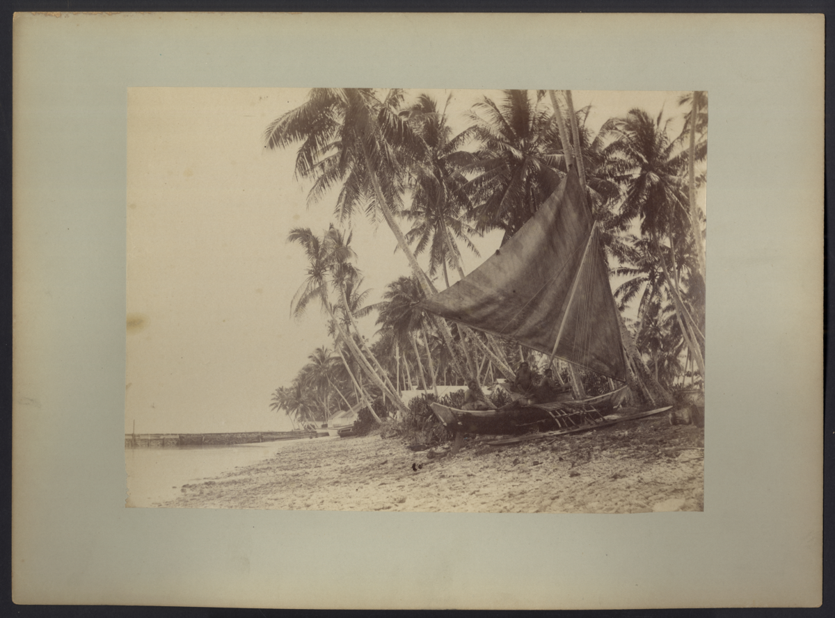 Bilden visar en grupp av två med män, en pojke och tvår flickor med traditionella kläder som sitter framför en hydda på en strand på Jaluit.