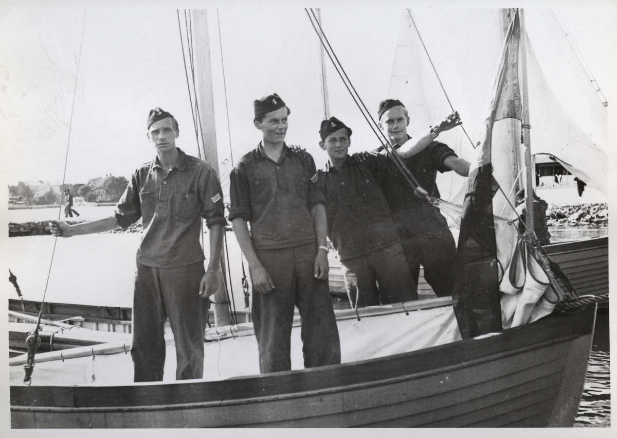 Titel: Porträtt av fyra värnpliktiga som står i en mindre segelbåt