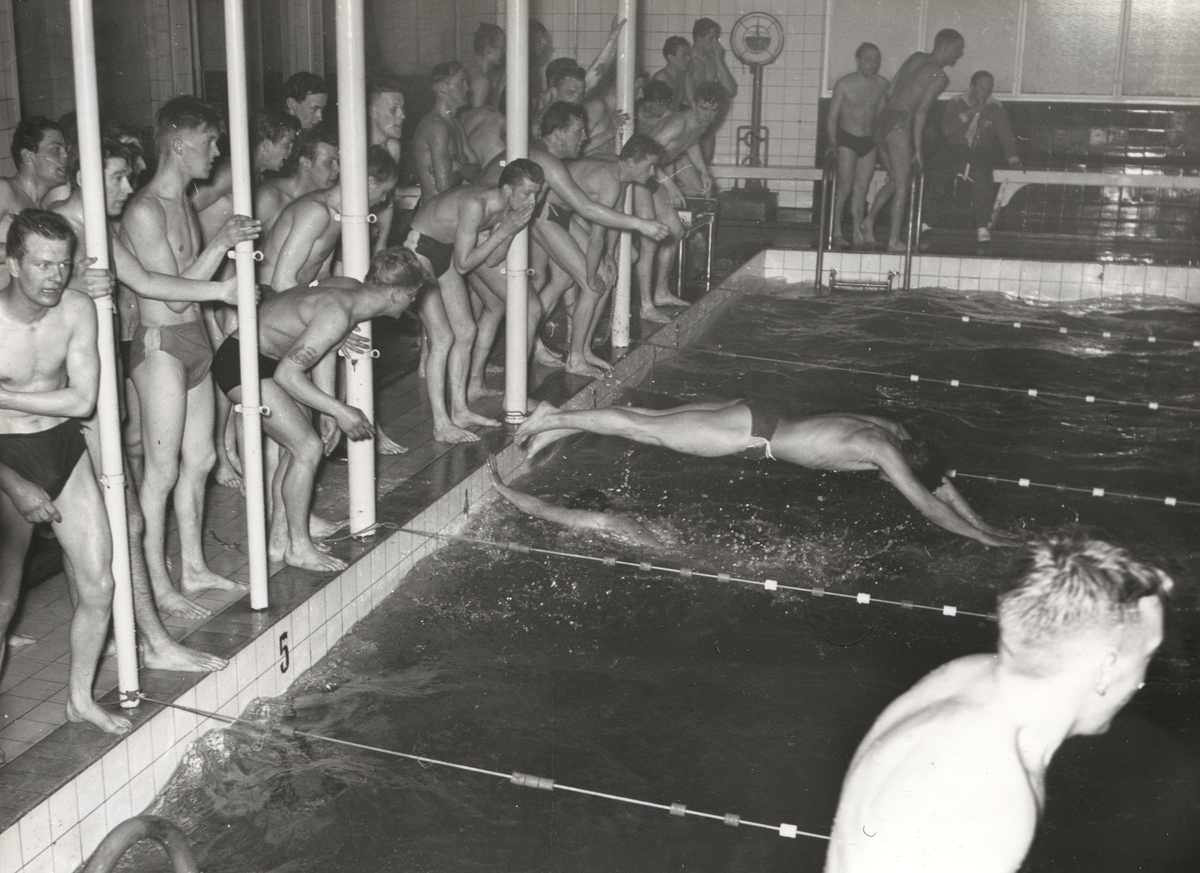 Titel: Unga män tävlar i stafettsimning. En av dem syns dyka i medan en annan står i förgrunden när kameran.