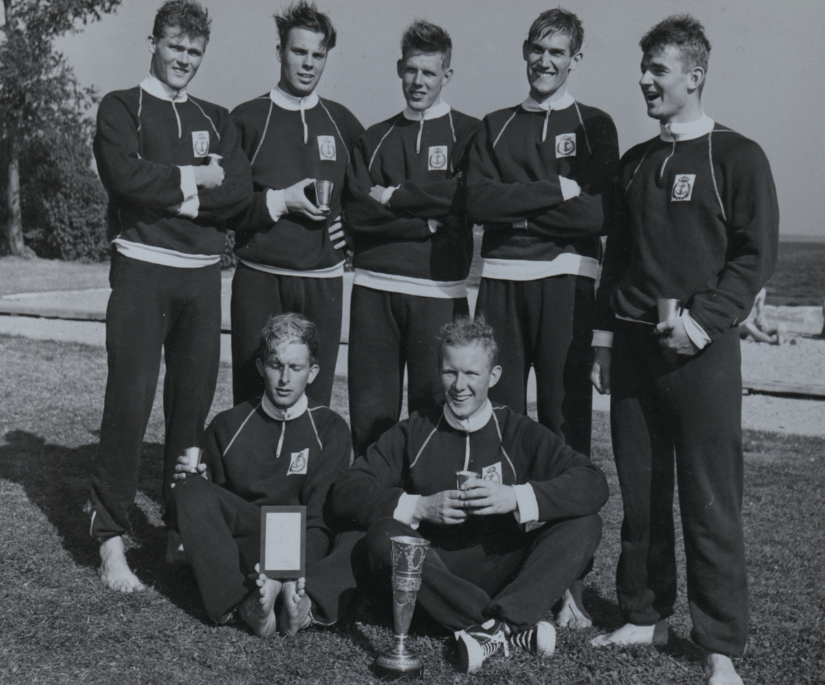 Sju unga män som utgör vinnarlag i lagkappsimning poserar i grupp framför kameran. De är iklädda träningskläder med flottans emblem på. Fem av dem står och två sitter ned i gräset. De håller varsin vinnarkopp och de sittande har även vandringspris i form av en hög, utsirad pokal och en guldsköld. Bild från Marinmästerskapet i allmän idrott.