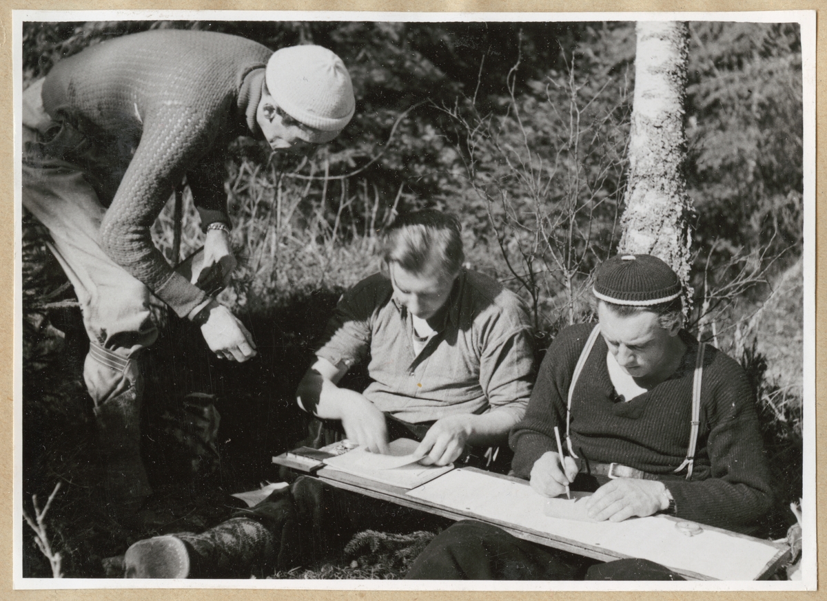 Två män sitter på marken ute i naturen. I knät har de en planka, vilken de använder som stöd för att skriva och organisera bland papper. Ytterligare en man står bredvid och lutar sig fram mot de två sittande männen. Samtliga är klädda i byxor och tröja. Två av dem har även mössa på huvudet.