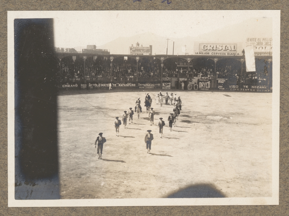Titel: Bilden visar tjurfäktare som promenerar genom tjurfäktningsarenan.