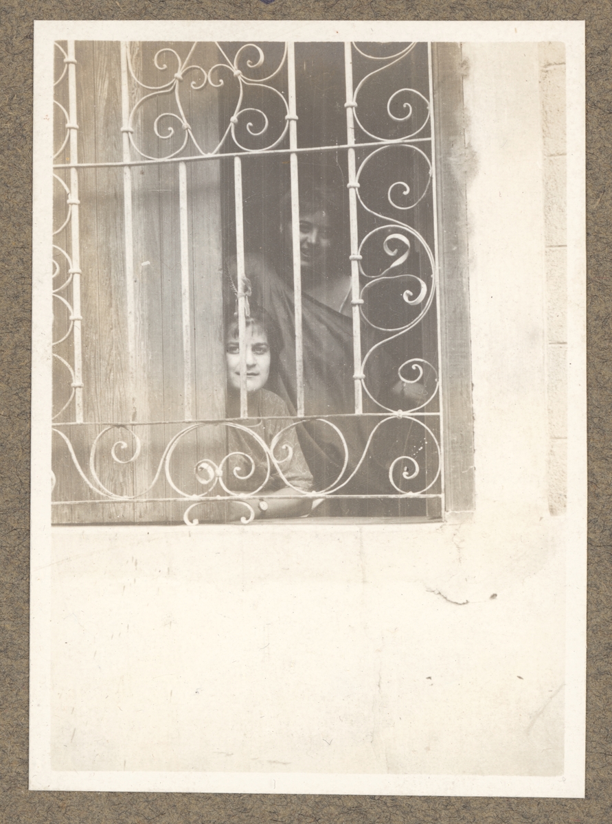 Titel: Två kvinnor kikar ut genom ett fönster som är försedd med ett smidesgaller.