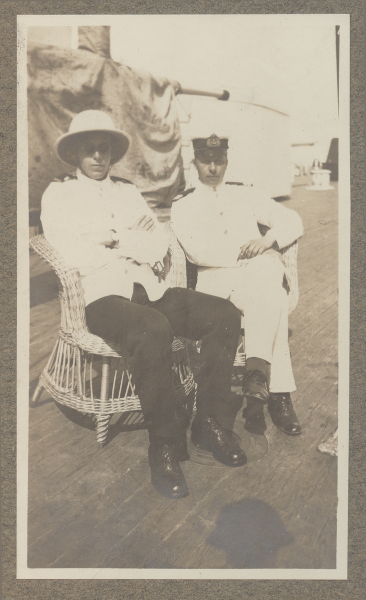 Titel: Två sjöofficerare i vita uniformer sitter i korgstolr ombord på Fylgia.