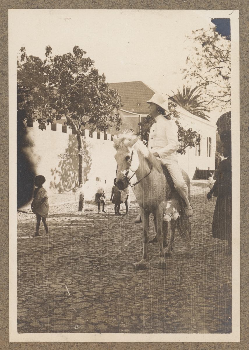 Titel: Bilden visar en befäl från Fylgia som rider på en häst och beskådar ett samhälle på Sao Vicente.