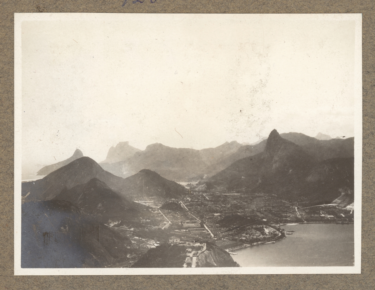 Bilden föreställer en vy från Sockertoppen över Rio de Janeiro. Den markanta toppen på höger sidan är berget Corcovado innan kristusstatyn Cristo Redentor byggdes.