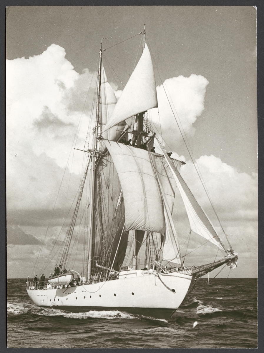 Bilden visar en av Marinens skolskepp Gladan eller Falken under segling från styrbordssidan framifrån. Flera sjömän håller på att bestiga skeppsbåten som är firad upp.