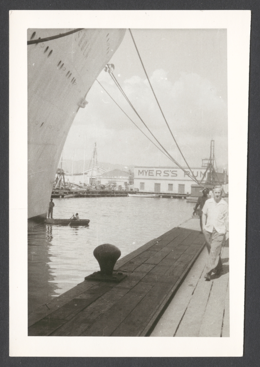 Fotografi av en hamnmiljö under resa med Sea Cloud. Förgrunden domineras av kajkanten med en pollare. Två sjömän promerar längst kajen. På vänster sida syns förskeppet av ett stort stålfartyg som ligger förtöjt i hamnen.