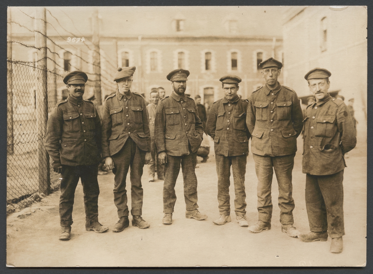 Denna grupporträtt visar sex engelska krigsfångar i en fängelsegård som enligt påskriften ska representerar olika delar av England. Men bara den ena kännetecknas som skotskt genom sin mössa.