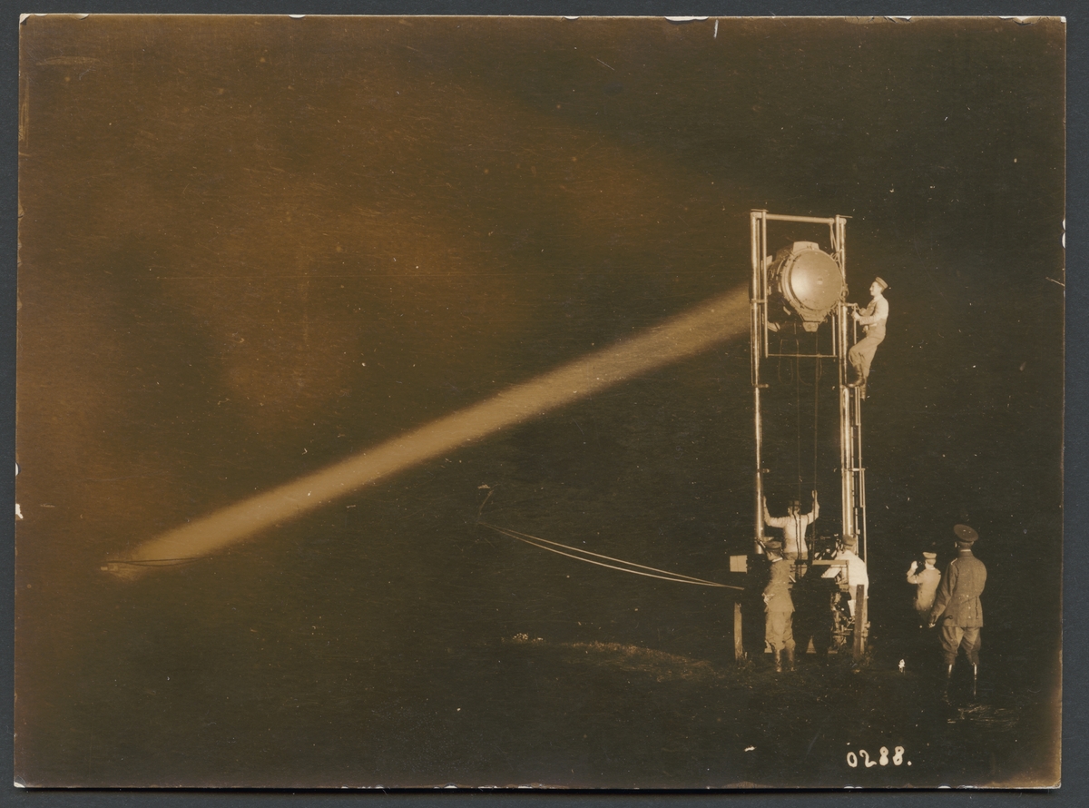 Titel: Bilden visar en grupp soldater som arbetar med en stor strålkastare.