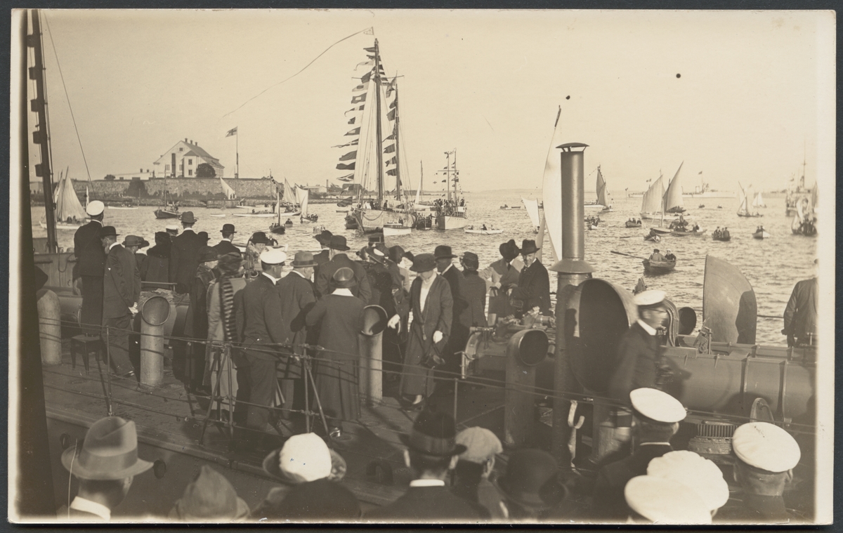 Bilden visar världsomseglaren "Fidras" hemkomst till Karlskrona sommaren 1922. Fidra är den stora tvåmastat segelfartyg som syns i centrum av bilden. Den har storflaggad och ackompanjeras av ett mindre segelfartyg på babordssidan. Runt omkring är havet fyllt med många småbåtar som hälsar Fidra välkommen, bland annat flera barkarna. Förgrunden domineras av mörkklädda åskådare som befinner sig ombord på ett ångfartyg.