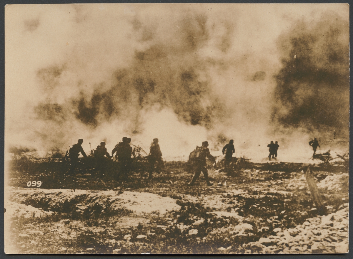 Bilden visar infanterisoldater som springer över slagfältet under ett pågående strid. I bakgrunden täcker stora rökmoln från artillerield och explosioner sceneriet.
