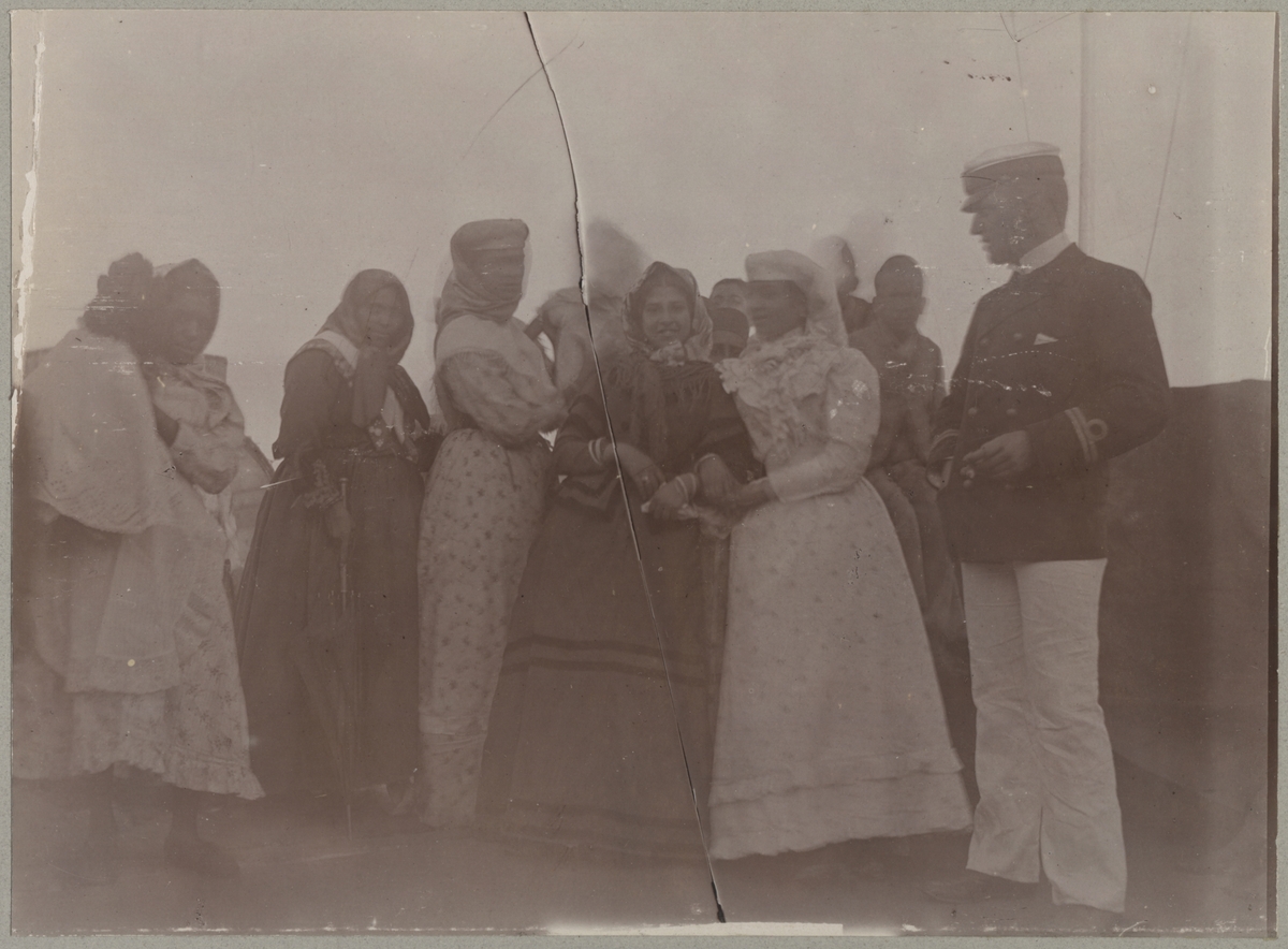 Titel: En grupp kvinnor i traditionella kläder vistas ombord på Balder. En av befälen tittar intresserat på de.