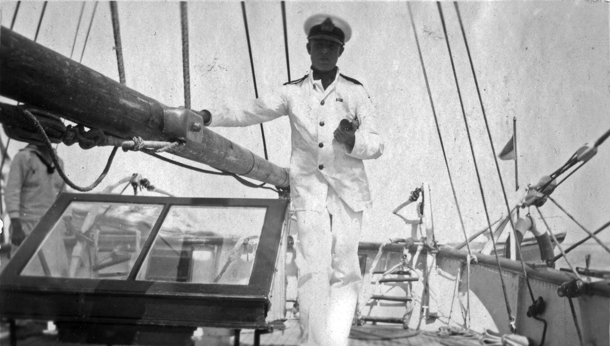 Sjöbefäl på fartygs däck i vit uniform under insegling till Lübeck, 1924.