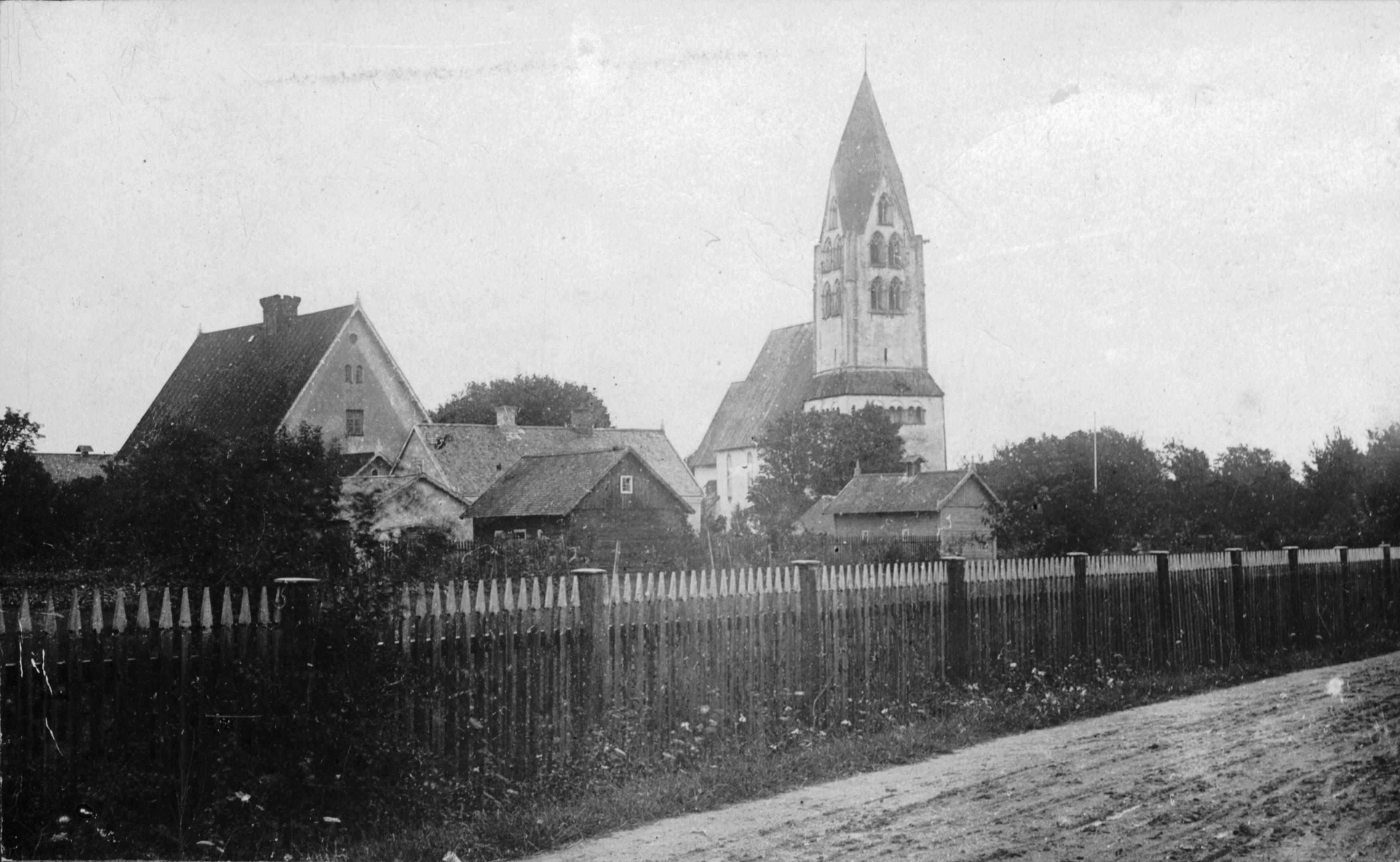 Kyrkan från nordväst med omgivande bebyggelse.