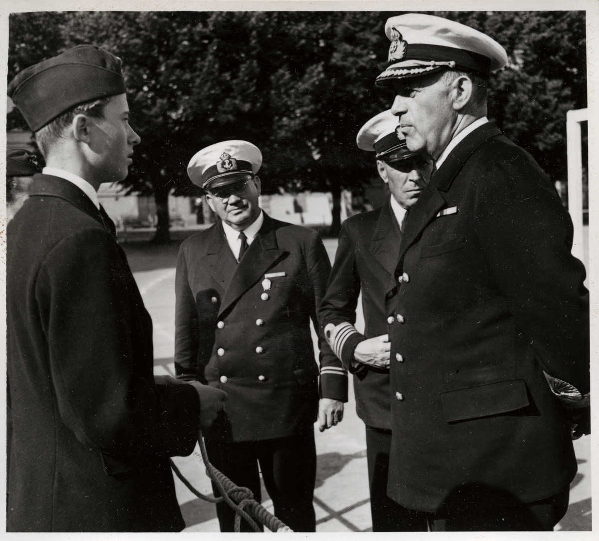 I förgrunden står en rekryt och samtalar med viceamiral Fabian Tamm. Männen ses i profil och rekryten håller i ett tunnare rep som är slaget i en knop runt en tamp. Strax bakom dem står en kommendör och en löjtnant, vilka ses rakt framifrån. I bakgrunden syns träd och antydan till bebyggelse.