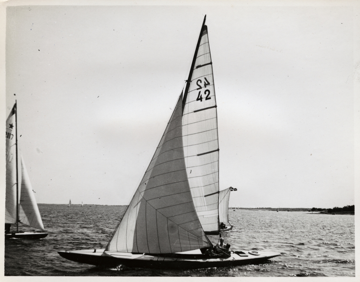 Segelbåtar till sjöss. I den ena sitter två män och på segelduken syns ett nummer, 42.