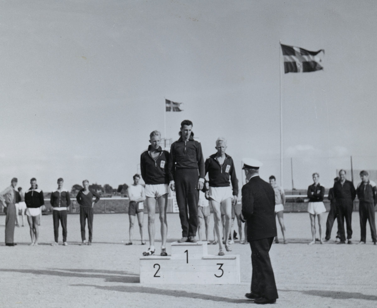 Tre unga män står på en prispall som tredje, andra och förstapristagare. Framför dem kommer konteramiral Johan Erik Samuelson gående för att dela ut priser. I bakgrunden syns fler unga män, de flesta idrottsklädda som de tre pristagarna. Bortom dem syns två tretungade sverigeflaggor. Bild från Marinmästerskapet i allmän idrott.