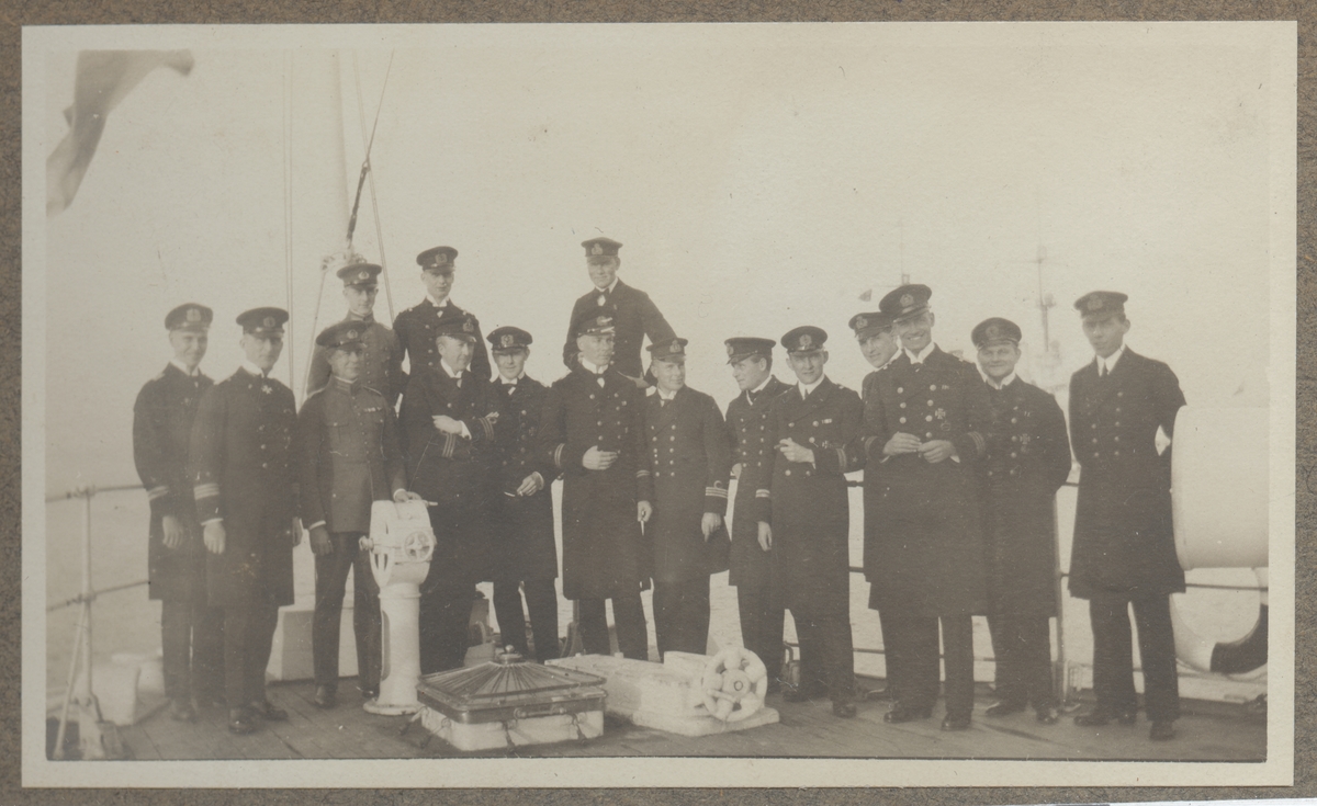 Titel: Fylgias befäl har tagit uppställning på akterdäcket för en gruppfoto.