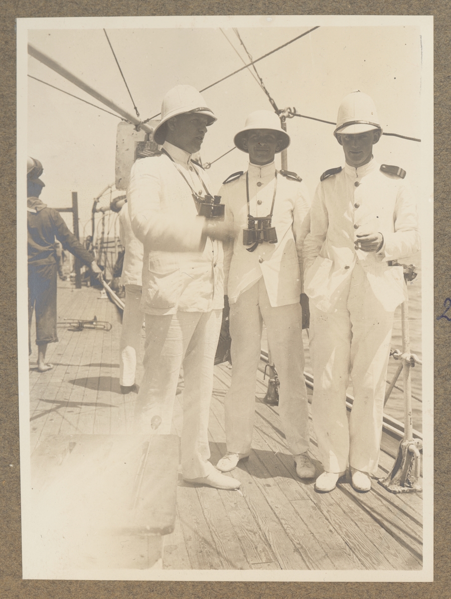 Titel: Tre sjöofficerare i vita uniformer med tropikhjälmar för ett samtal och röker ombord på Fylgia.