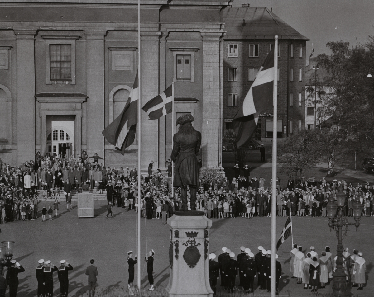 En folksamling har samlats utanför Fredrikskyrkan på Stortorget i Karlskrona och tittar på när två flottister hissar eller halar den svenska flaggan. Vid Karl XI:s staty står uniformsklädda militärer uppställda, varav några gör honör. I bakgrunden bakom kyrkan skymtar militärhemmet.