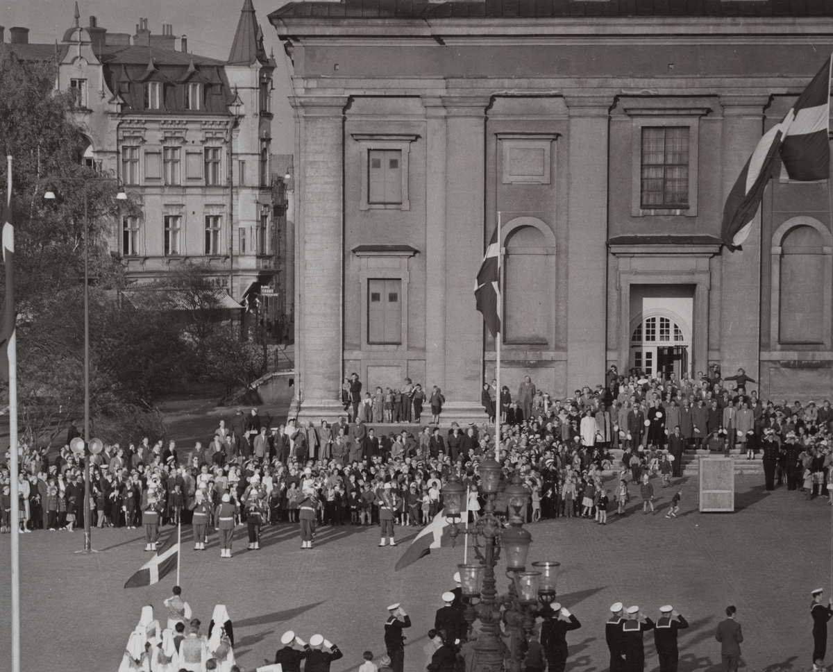En folksamling har samlats utanför Fredrikskyrkan på Stortorget i Karlskrona. Till vänster framför folksamlingen står en militärklädd musikkår och spelar musik. I bild syns även flottister som gör honör.