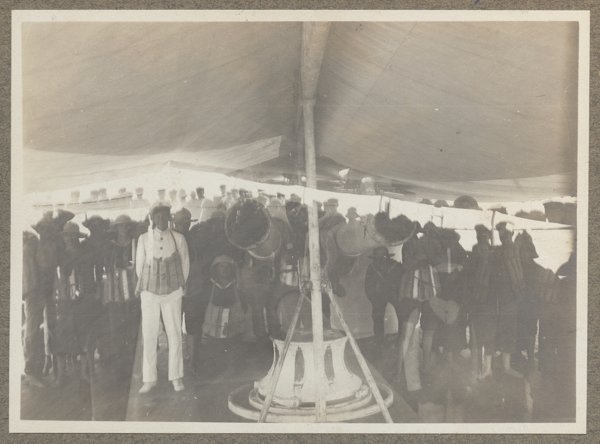 Titel: På denna dubbelexponering syns två gruppfotografier med besättningsmedlemmar som bär flytvästar.