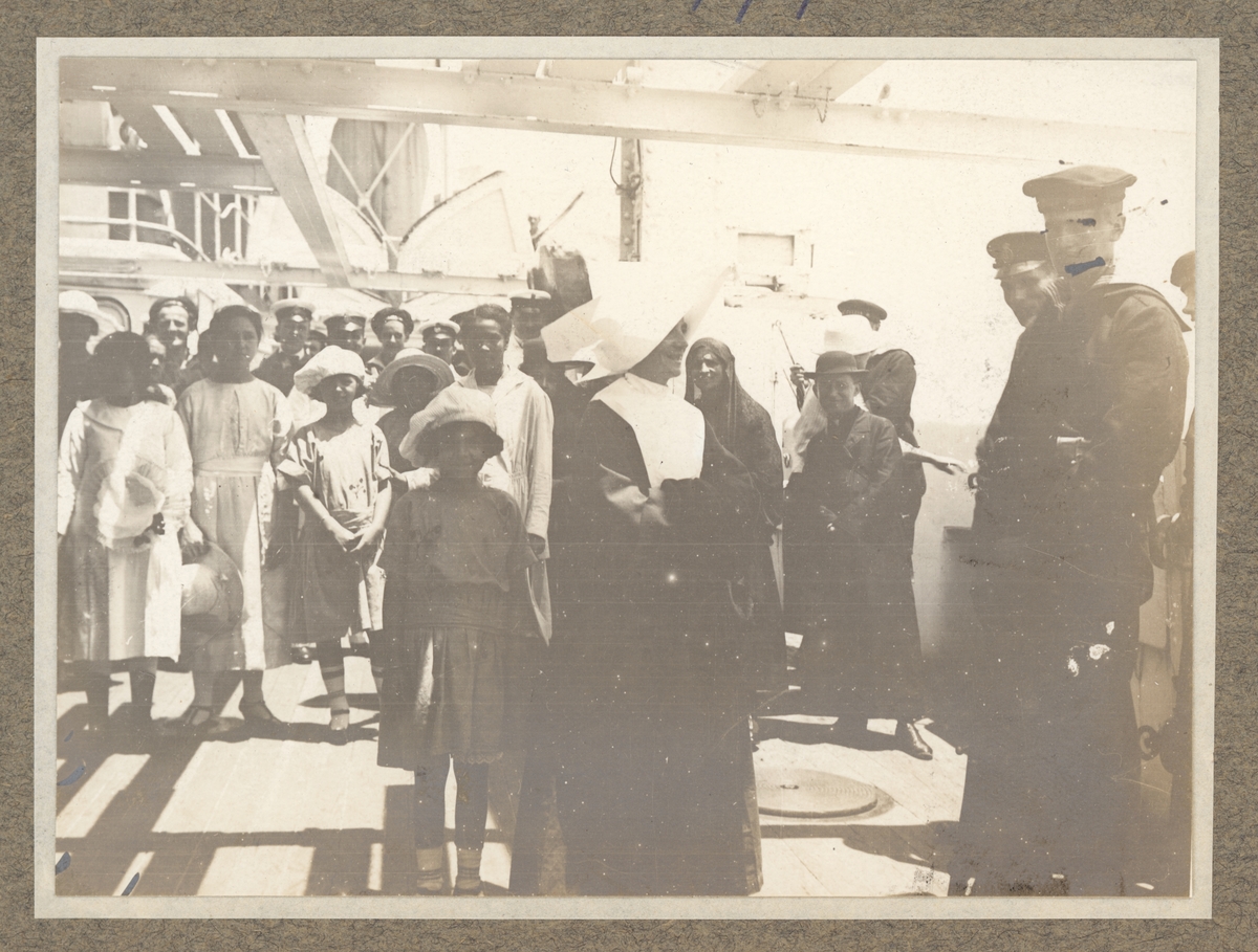 Titel: En nunna och en grupp barn möter besättningsmän på Fylgia.