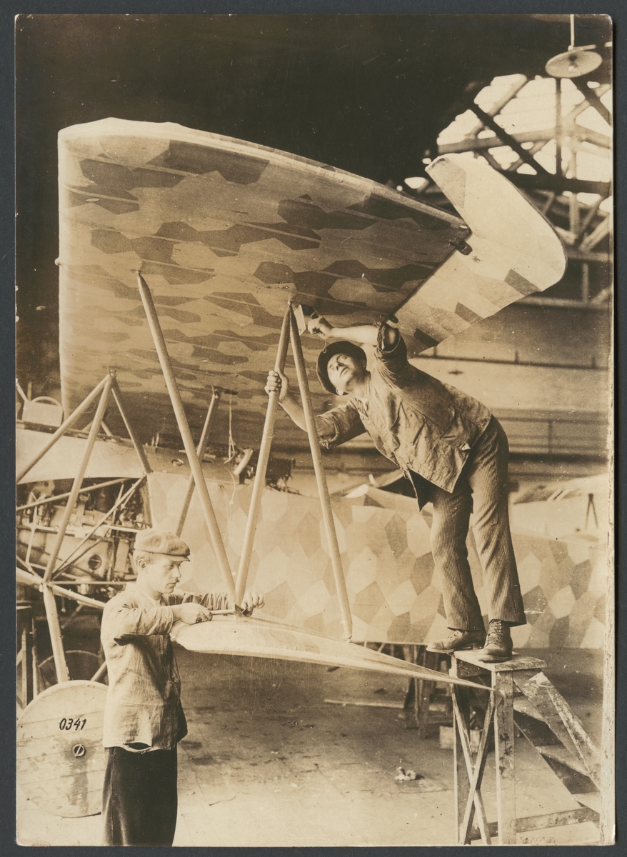 Bilden visar monteringen av flygplansvingar på ett tyskt stridsflygplan. Flygplanet är försedd med en maskeringsmålning.