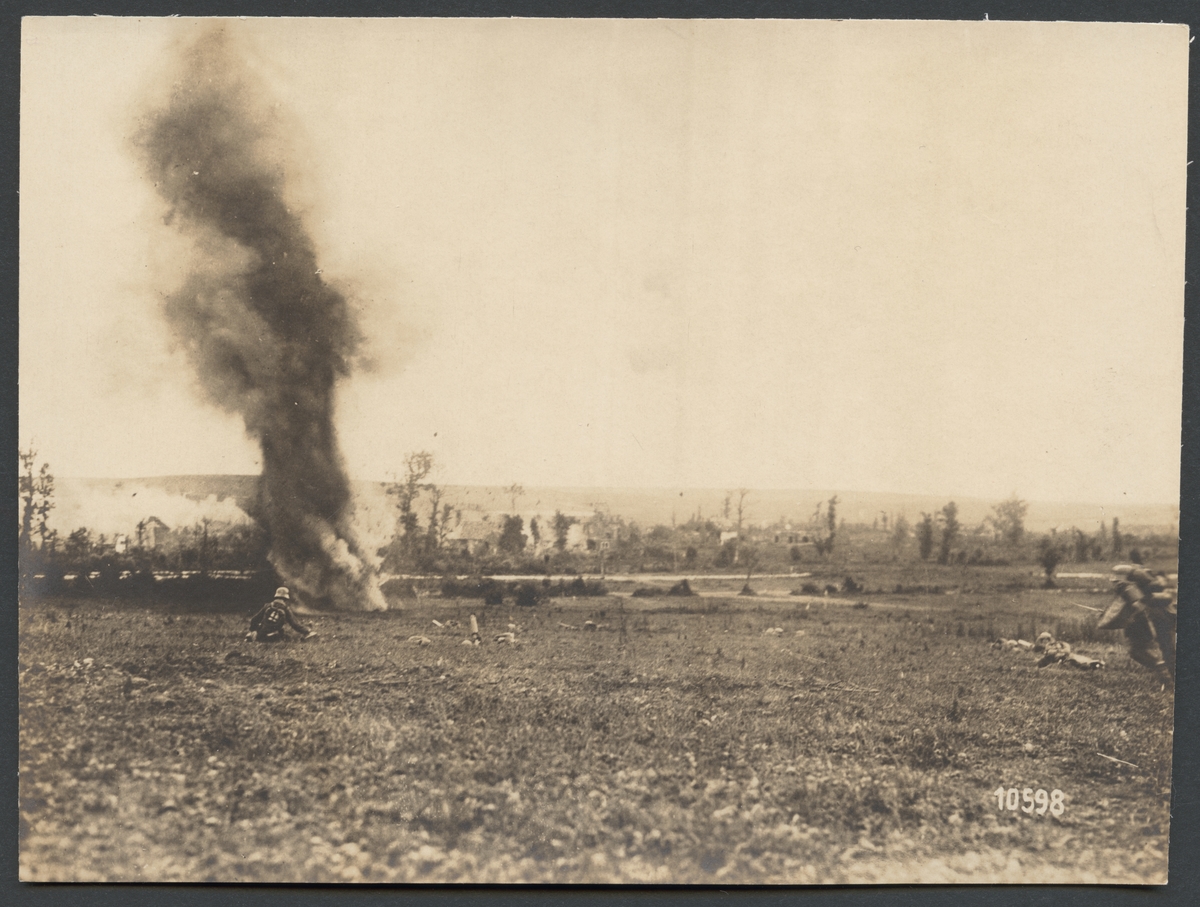 Bilden visar infanterisoldater på slagfältet under ett pågående strid. På vänster sidan sticker rökmoln från exploderande granater upp.
