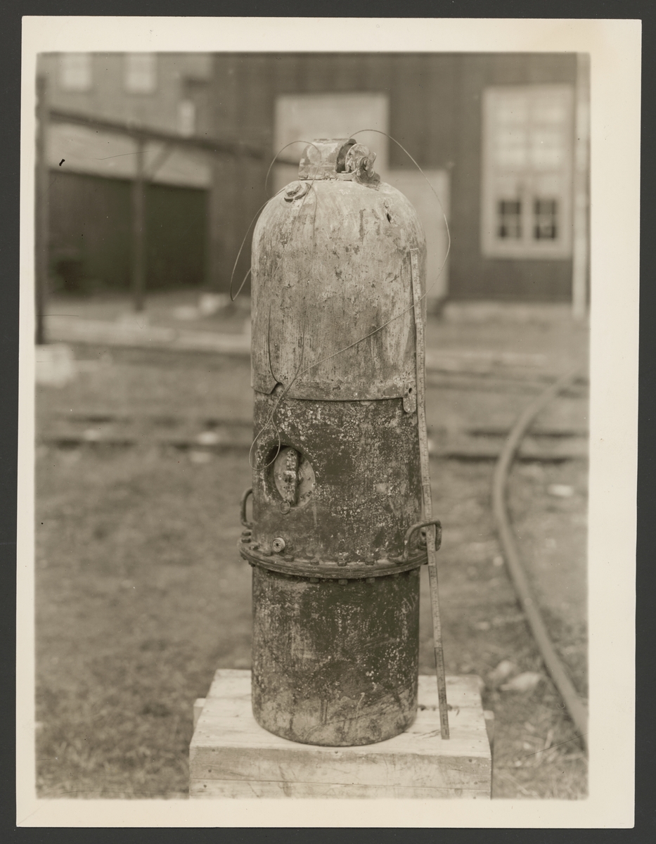 Bildserie som dokumenterar desarmeringen av en tysk tillverkad sjunkbomb som hittades 1936 vid Hasslö av besättningen från trålaren "Försten.