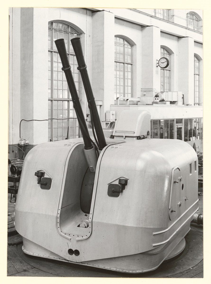 Titel: Bilden visar en kupol med tvillingskanon i en fabrikshall.