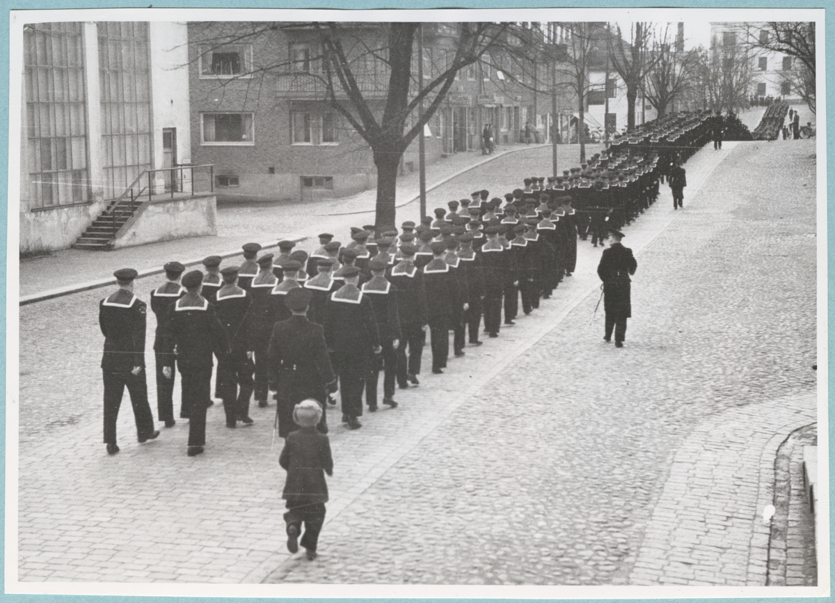 Kyrkparad för nyinryckta värnpliktiga. Ett långt led av värnpliktiga flottister paraderar längs Drottninggatan mor Vallgatan. Vid sidan av leden går befälhavande och högre ställda militärer. Till höger i bild skymtar den nu rivna Sparre simhall. Bakom militärleden springer ett barn.