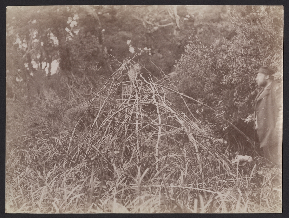 Bilden visar Hjalmar Stolpe som inspekterar övergivna indianhyddor i skogen längs Magellans sund. Det syns bara den överblivna stommen av grenar, huden som täckte hyddan är borttagna.