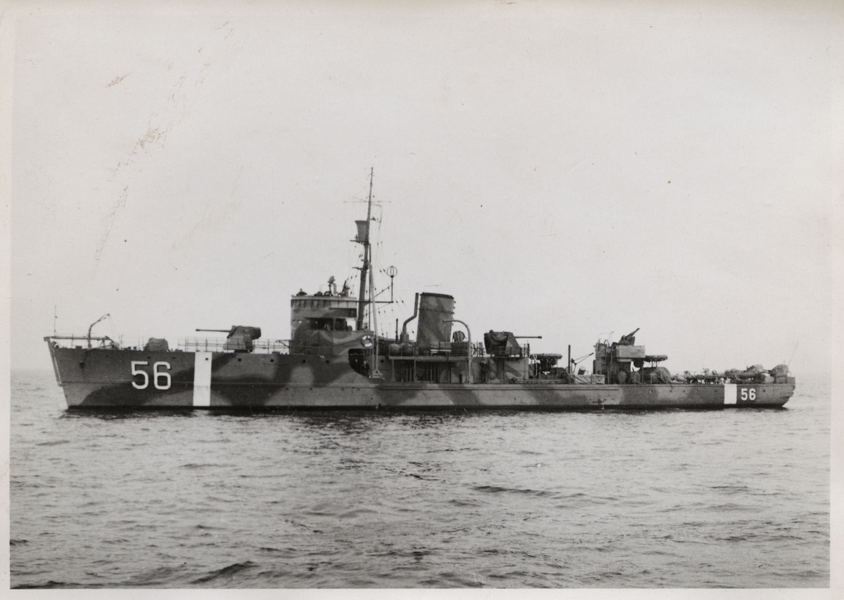 Fotot visar ett fartyg ute på havet, minsveparen Holmön. Endast hav och himmel syns i bakgrunden.