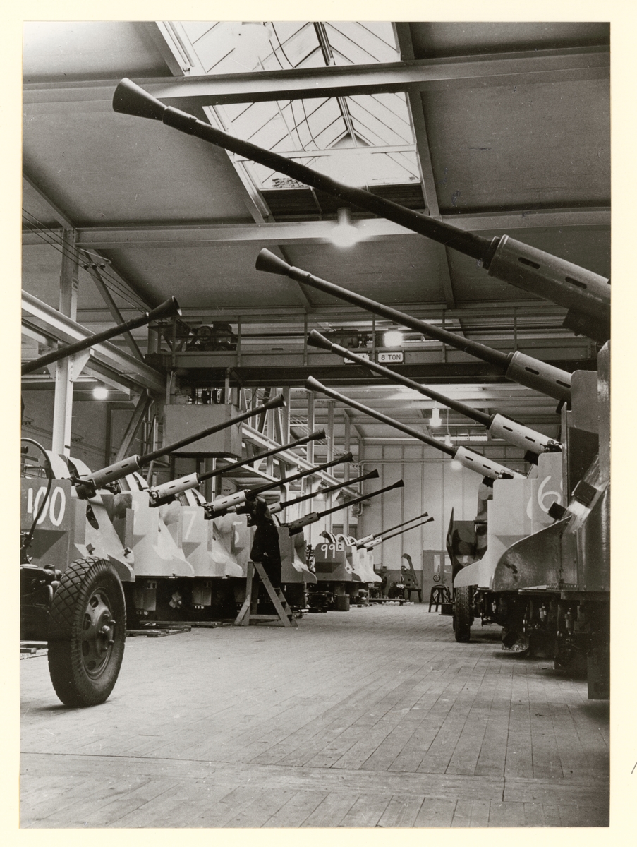 Bilden visar en större mängd uppenbarligen nytillverkade 40 mm automatkanoner från Bofors som står uppställt i ett lagerhus.