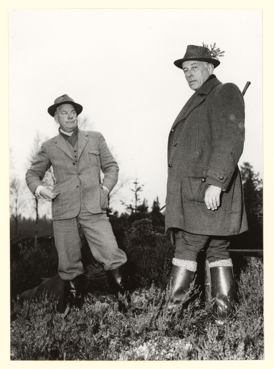 Titel: Bilden visar Gunnar Jedeu-Palmgren och en annan man i jaktkläder.