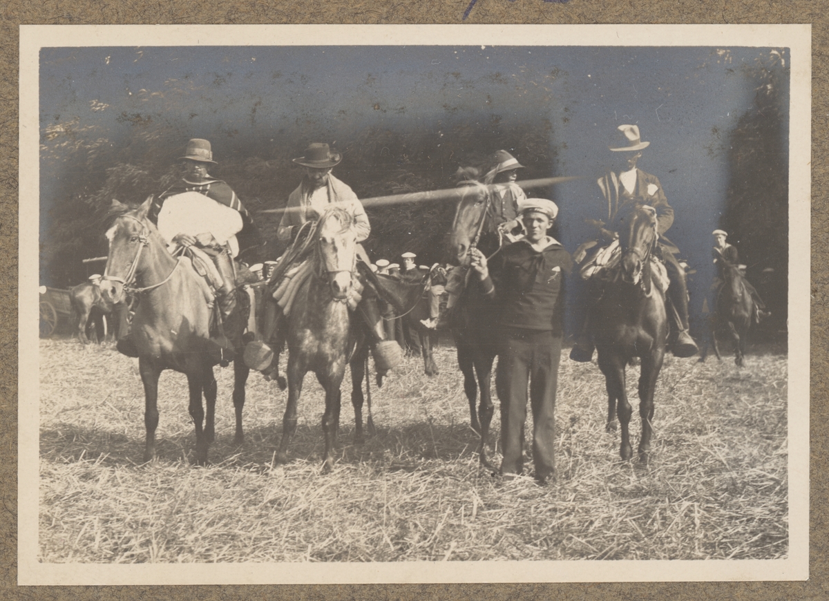En sjöman möter fyra män till häst från lokalbefolkningen. Han leder en häst som bär ett barn. I bakgrunden syns en större grupp sjömän.